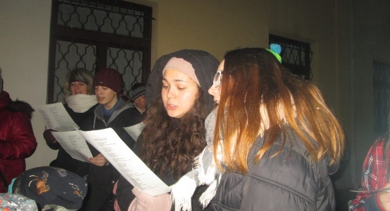 Žáci domova mládeže v Šalounově ulici s paní vychovatelkou Douskovou si zazpívali koledy na nádvoří hořického zámku – Česko zpívá koledy.