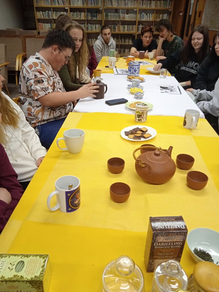 Dne 30. 3. 2022 jsme se zúčastnili besedy o ,,čaji“, kterou pro nás připravila pí. Preusslerová. Dozvěděli jsme se spoustu zajímavých poznatků o historii čaje, jeho pěstování, zpracování, nákupů a přípravě. Uvařili jsme si několik druhů čajů, například zelený čaj s Formossy, bílý čaj Pai mu tan nebo černý čaj Indiánské léto. Dozvěděli jsme se co je to “zhong” nebo jak vypadá “kalabasa” a jak se v ní připravuje čaj.