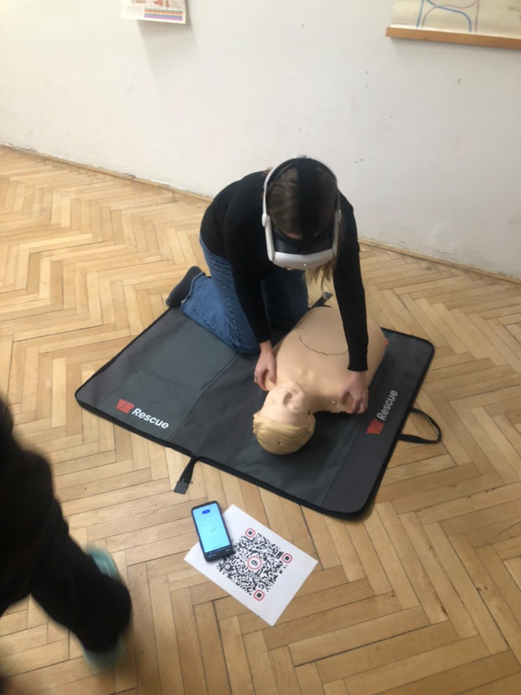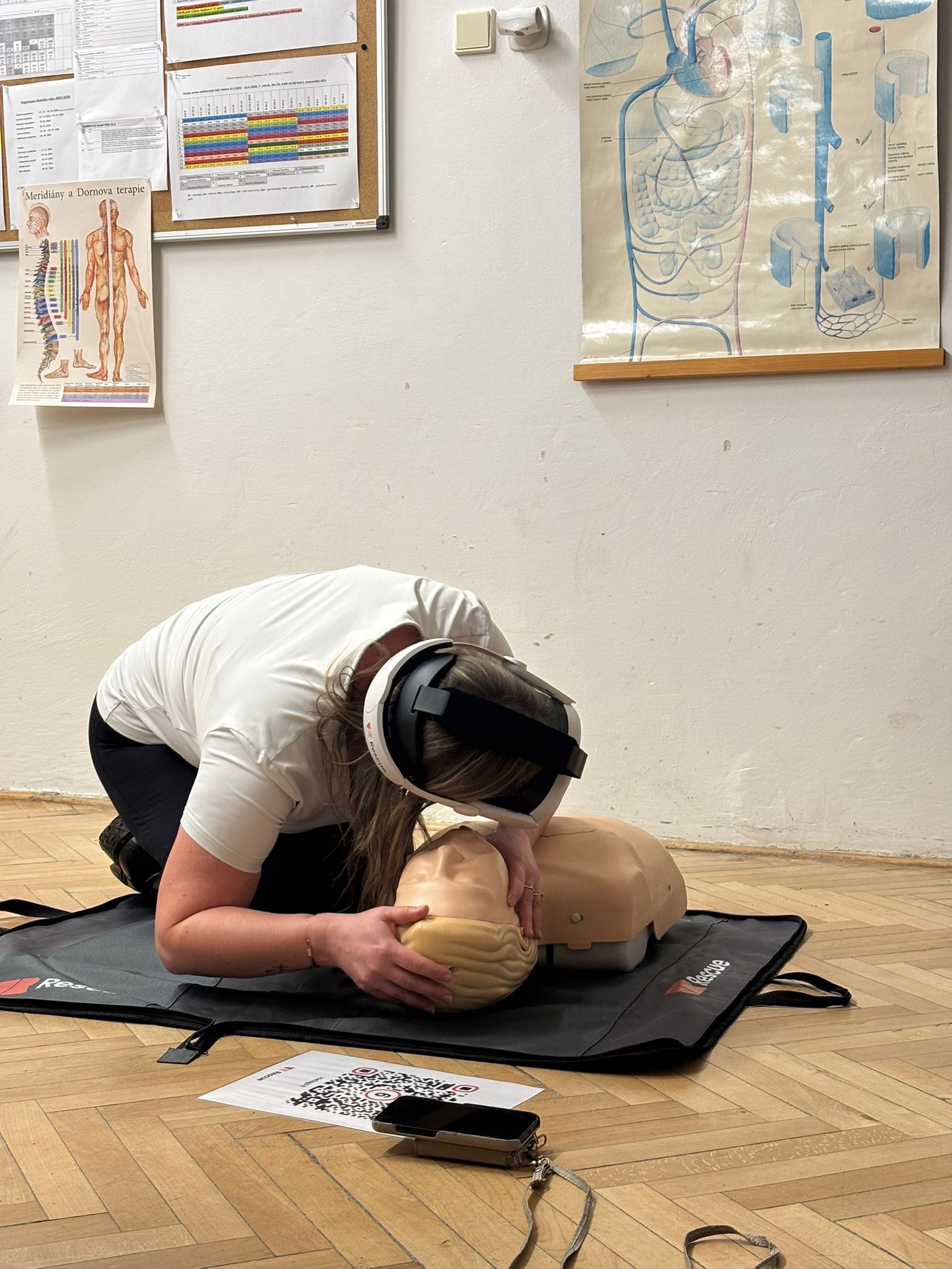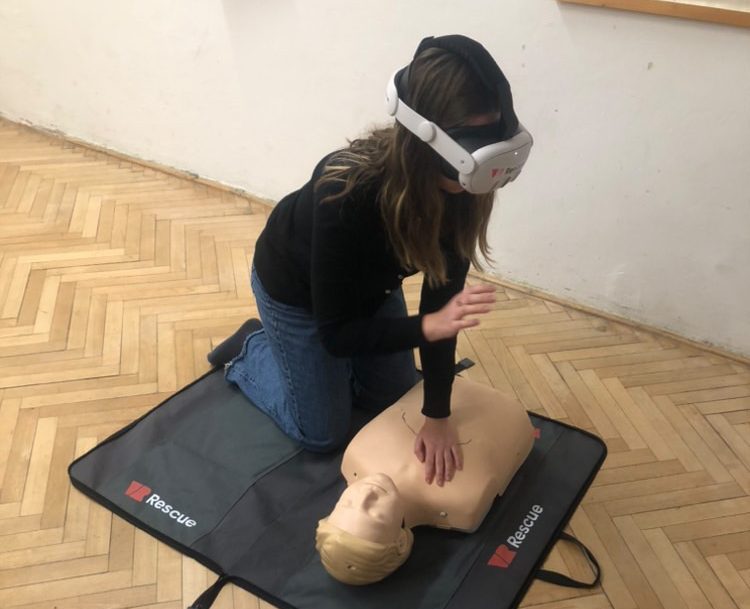 • 💙 vyzkoušet si nácvik resuscitace ve virtuální realitě, což jim umožnilo zažít realistické modelové situace první pomoci,
