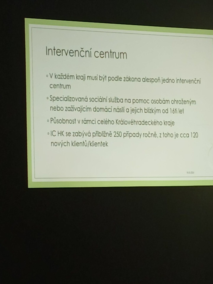 Studenti třetího ročníku oboru sociální činnost navštívili dne 18. února specializovanou sociální službu Intervenční centrum a Poradnu pro lidi v tísni v Hradci Králové. Mezi témata, která se rozkrývala patřilo: násilí, rizikové skupiny, práce multidisciplinárního týmu ve složení: sociální pracovník, právník, psycholog, terapeut a úskalí práce s touto cílovou skupinou.