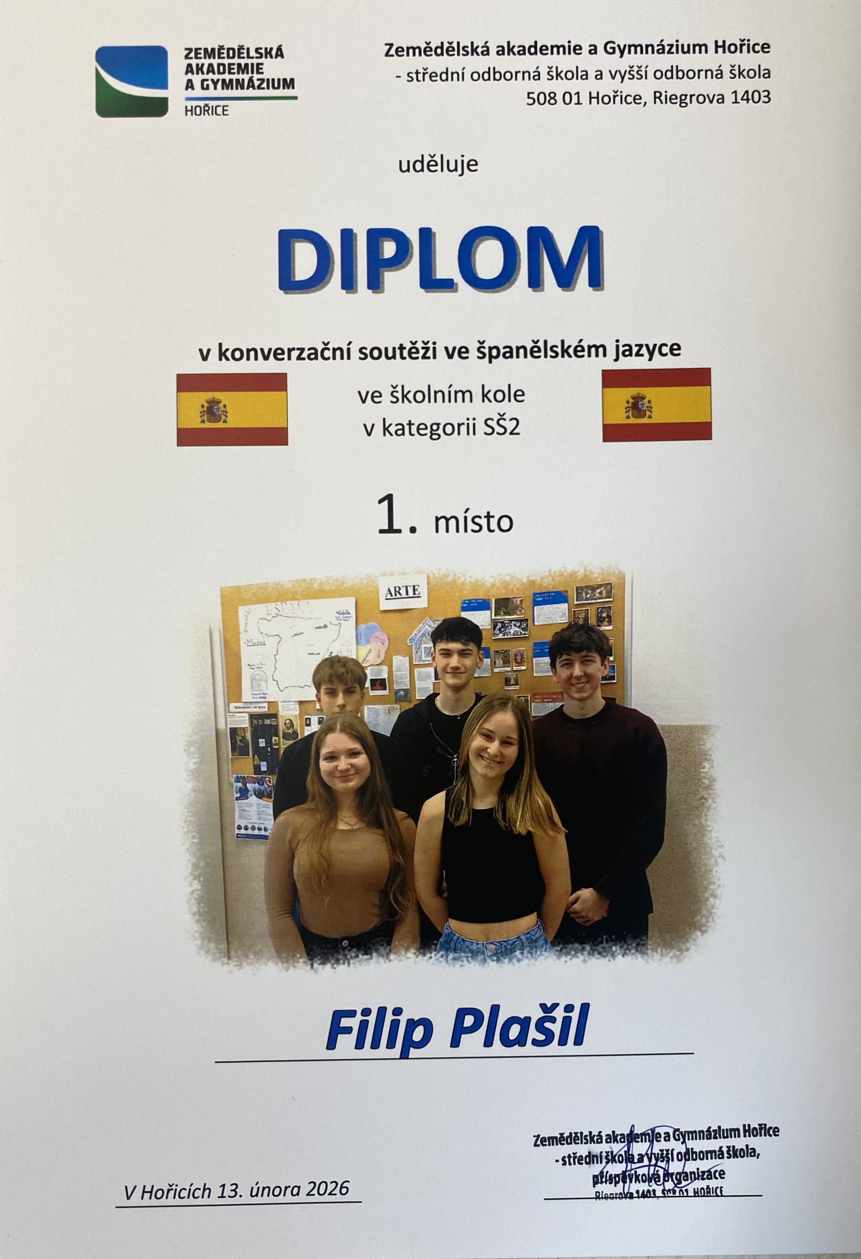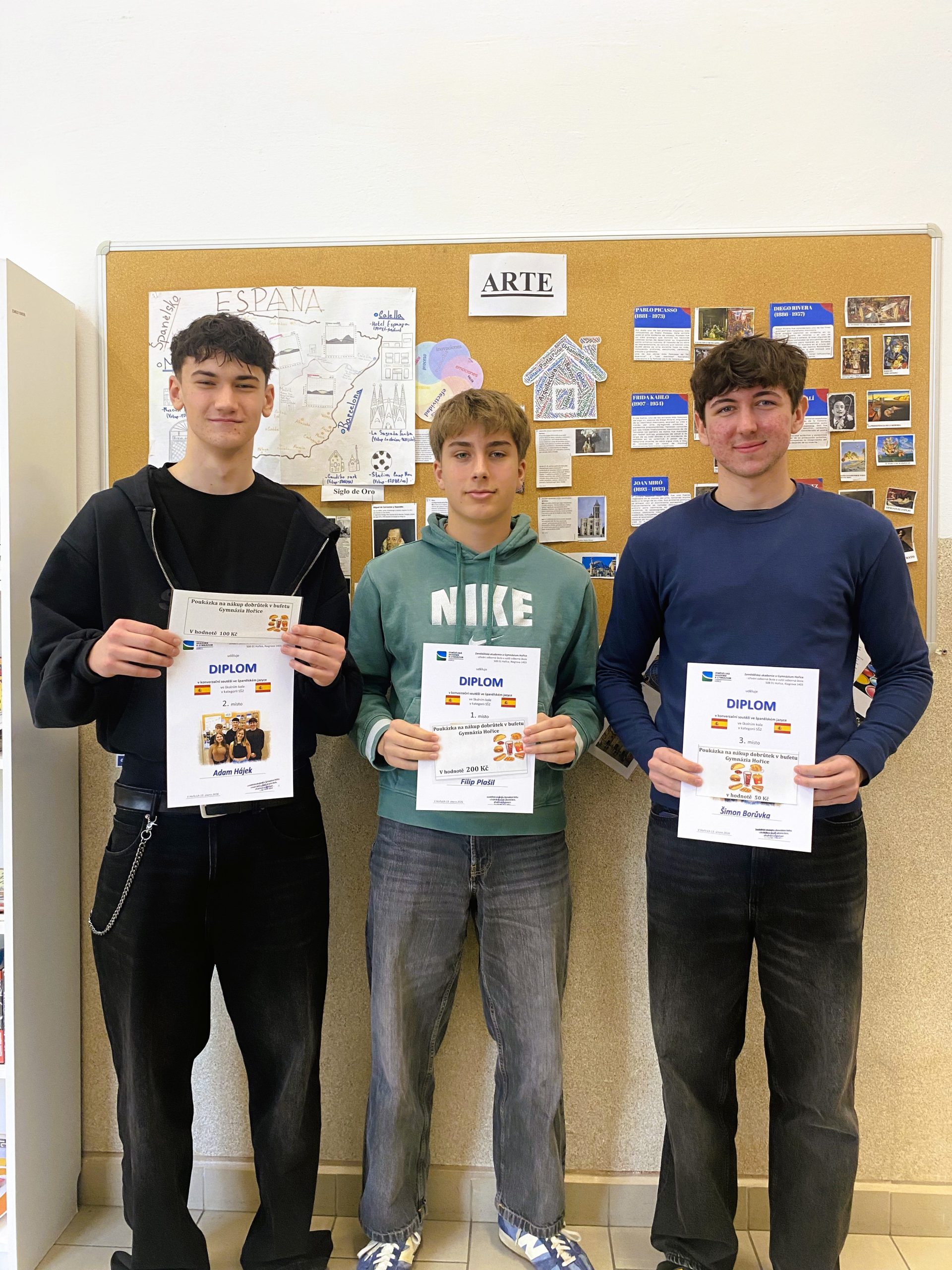V minulém týdnu proběhlo školní kolo konverzační soutěže ve španělském jazyce. Porota hodnotila jazykovou pohotovost a kreativitu, bohatost slovní zásoby, výslovnost, gramatickou správnost a plynulost vyjadřování.