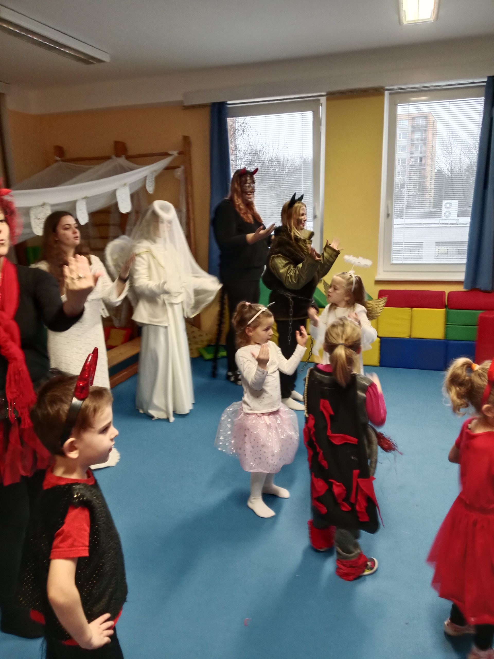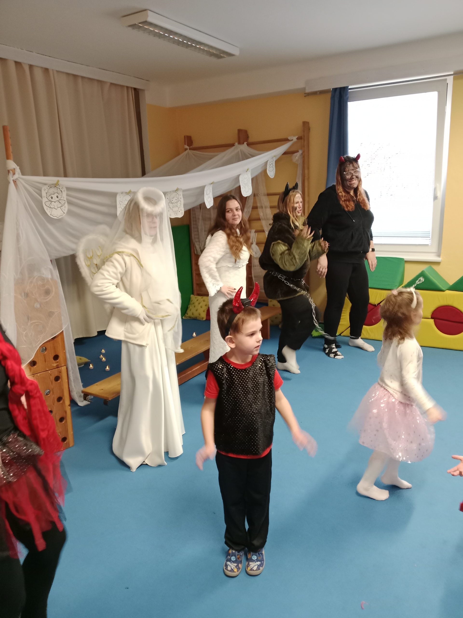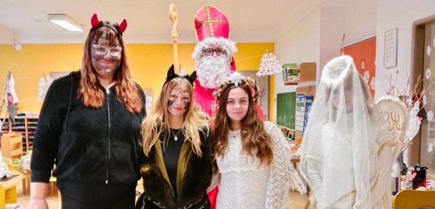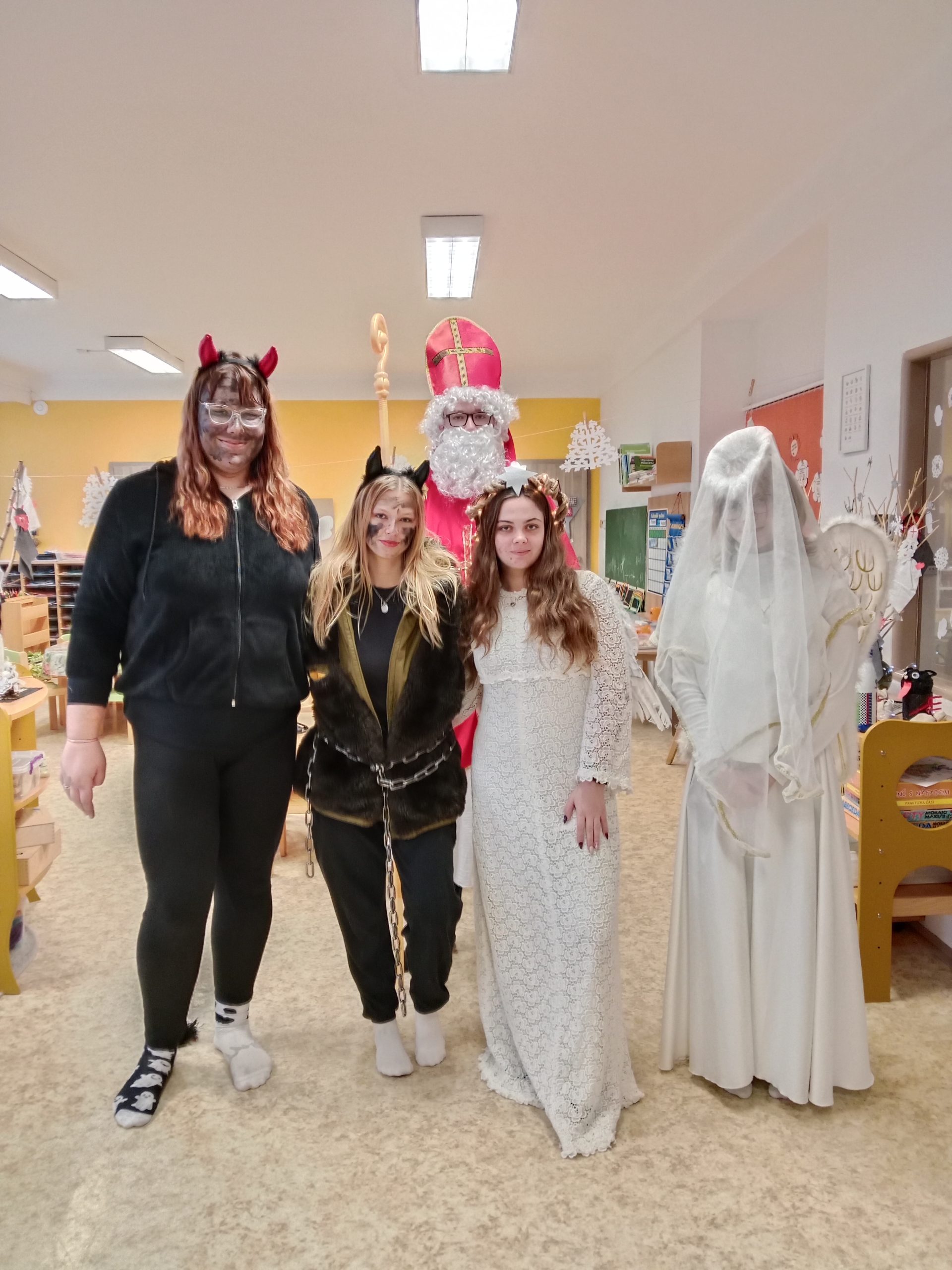 Studenti prvního až čtvrtého ročníku oboru Sociální činnost tvořili Mikuláše, čerty a anděly v pátek 5. prosince 2025 v Hořicích v Mateřské škole Pod Lipou.