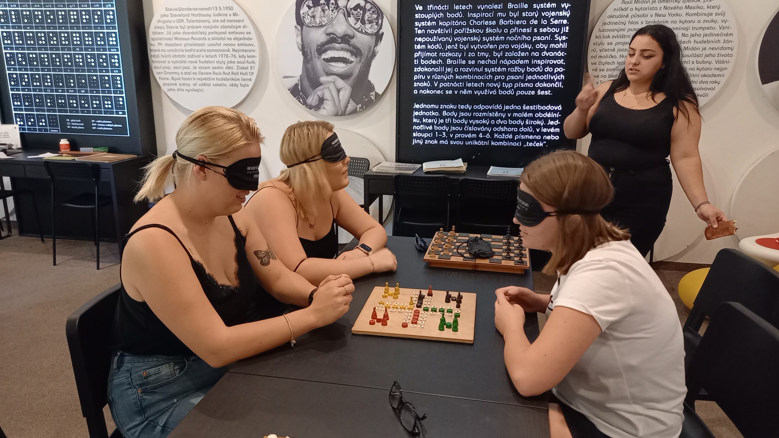 Jaký je svět pro nevidomého? Jak ovládá mobil? Jak vaří? Takové a další otázky mohli studenti pokládat nevidomým a slabozrakým osobám, jež jsou průvodci na Neviditelné výstavě. Třída 3.S oboru sociální činnost a skupina studentů třídy 6.G podnikla v úterý 3. října 2023 exkurzy do Novoměstské radnice na Neviditelnou výstavu. Milí čtenáři, nemůžeme vám vše prozradit, neboť byste příště věděli, do čeho jdete a chyběl by vám ten zážitek a moment překvapení. Proto Vám jen můžeme říci, že jsme byli rozděleni do skupin a s průvodcem jsme poznávali jeho svět a mohli jsme pokládat všemožné otázky. Dokonce jeden z průvodců pochází z Hořic, což nám bylo ještě milejší a osobnější. V doprovodné místnosti jsme si na oči nasadili klapky a hráli běžné hry, tak jak je mohou hrát nevidomí. Poznali jsme příběh francouzského chlapce Louise Brailla, který v dětství ztratil zrak a po němž je písmo pro nevidomé pojmenováno, četli jsme pod silnou lupou, poznávali jsme peníze a další.