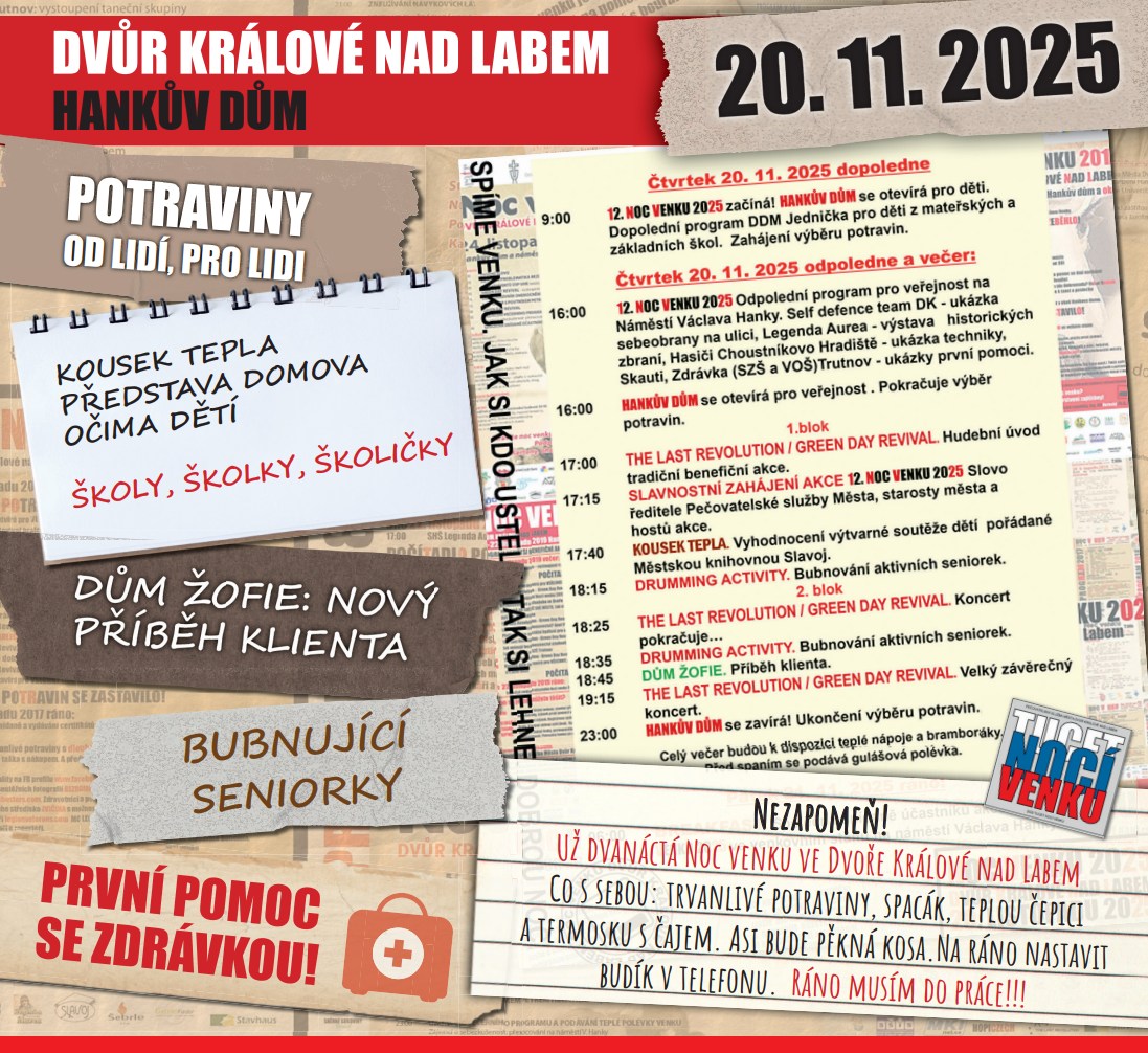 Studenti z řad dobrovolníků z oboru sociální činnost se aktivně zapojili do největší benefiční akce v okolí pro lidi bez domova Noc venku 2025, která se uskutečnila ve čtvrtek 20. listopadu 2025 v Hankově domě a na náměstí Václava Hanky ve Dvoře Králové nad Labem. Pomáhali při organizačním zajištěním akce a potkat jste je mohli u aktivity BRÝLÁRNA, kde si lidé mohli vyzkoušet speciální brýle, které sloužily k simulaci opilosti a drog.