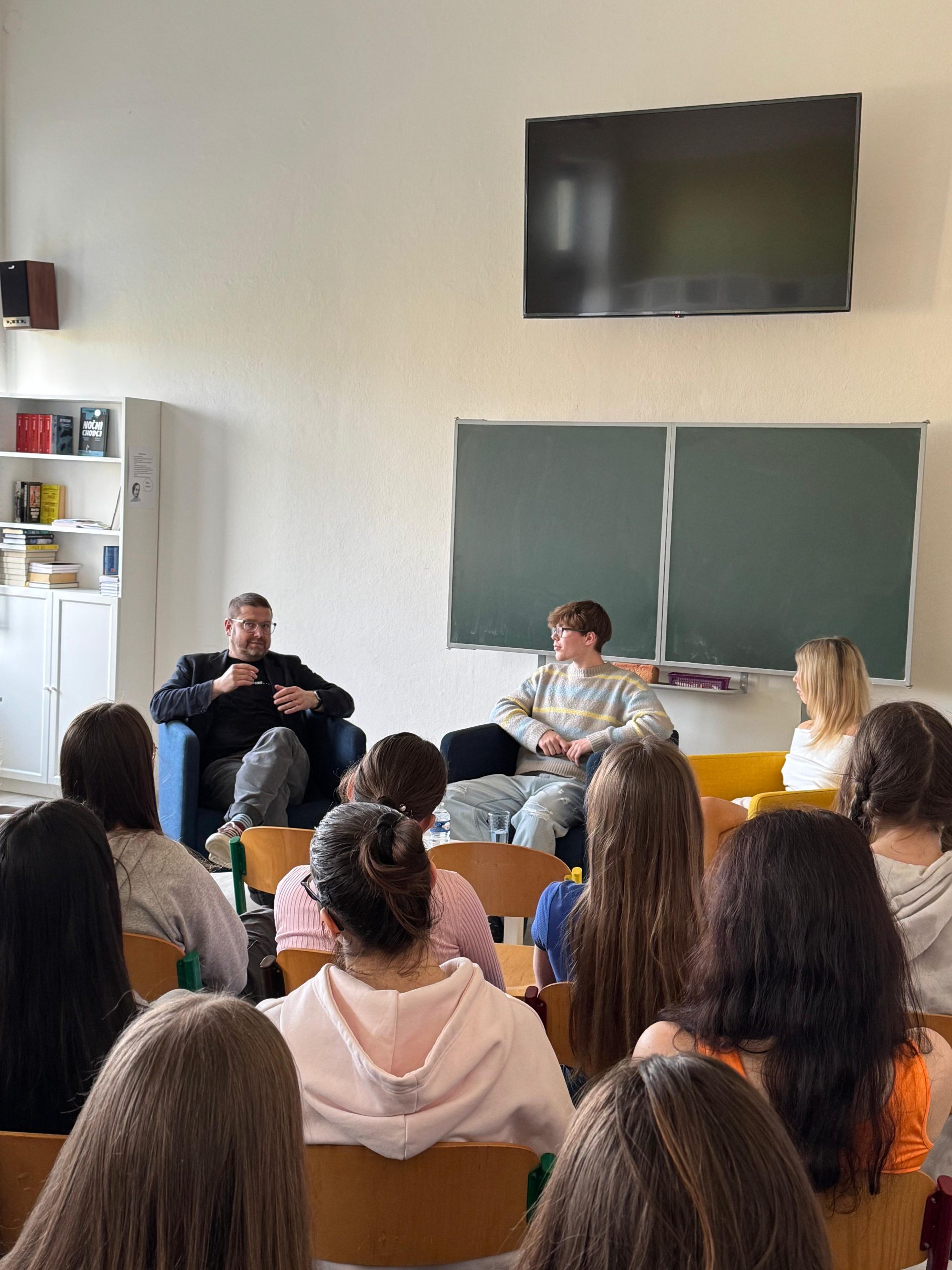Besedu moderovali studenti oktávy, kteří si pro hosta připravili řadu zajímavých otázek 🎤. Mluvilo se především o politice, médiích a jejich roli v demokratické společnosti, ale také o práci novináře a o tom, jak vznikají politické komentáře. Vedle vážnějších témat přišla řeč i na odlehčenější momenty – například na fotbal ⚽ nebo osobní zkušenosti z novinářské praxe.