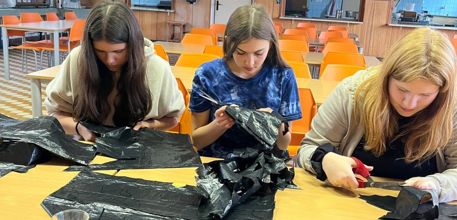 Žákyně z prvního ročníku sociální činnosti s paní vychovatelkou Douskovou připravují na domově mládeže výzdobu na Dýňové dopoledne, které proběhne 22. října 2025 na školním statku.