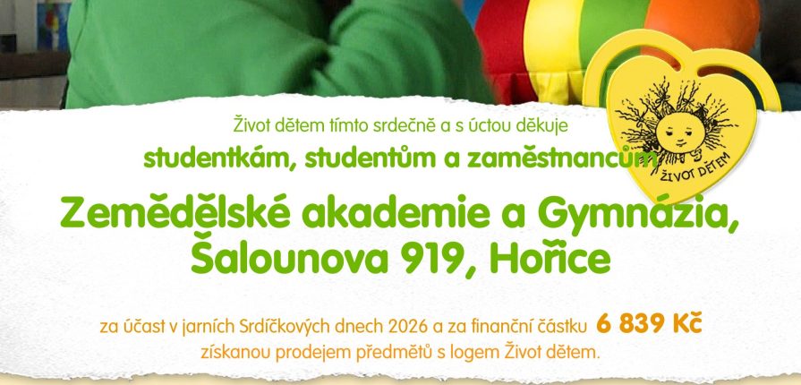 Vychovatelka paní Iva Dousková jako každoročně oslovila studentky oboru Sociální činnost, které se následně podílely na veřejné sbírce Srdíčkový den v Hořicích. Studentky prodejem předmětů s logem Život dětem vybraly částku 6.839 Kč, za což se jim dostalo poděkování od ředitelky organizace MgA. Marie Křepelkové.
