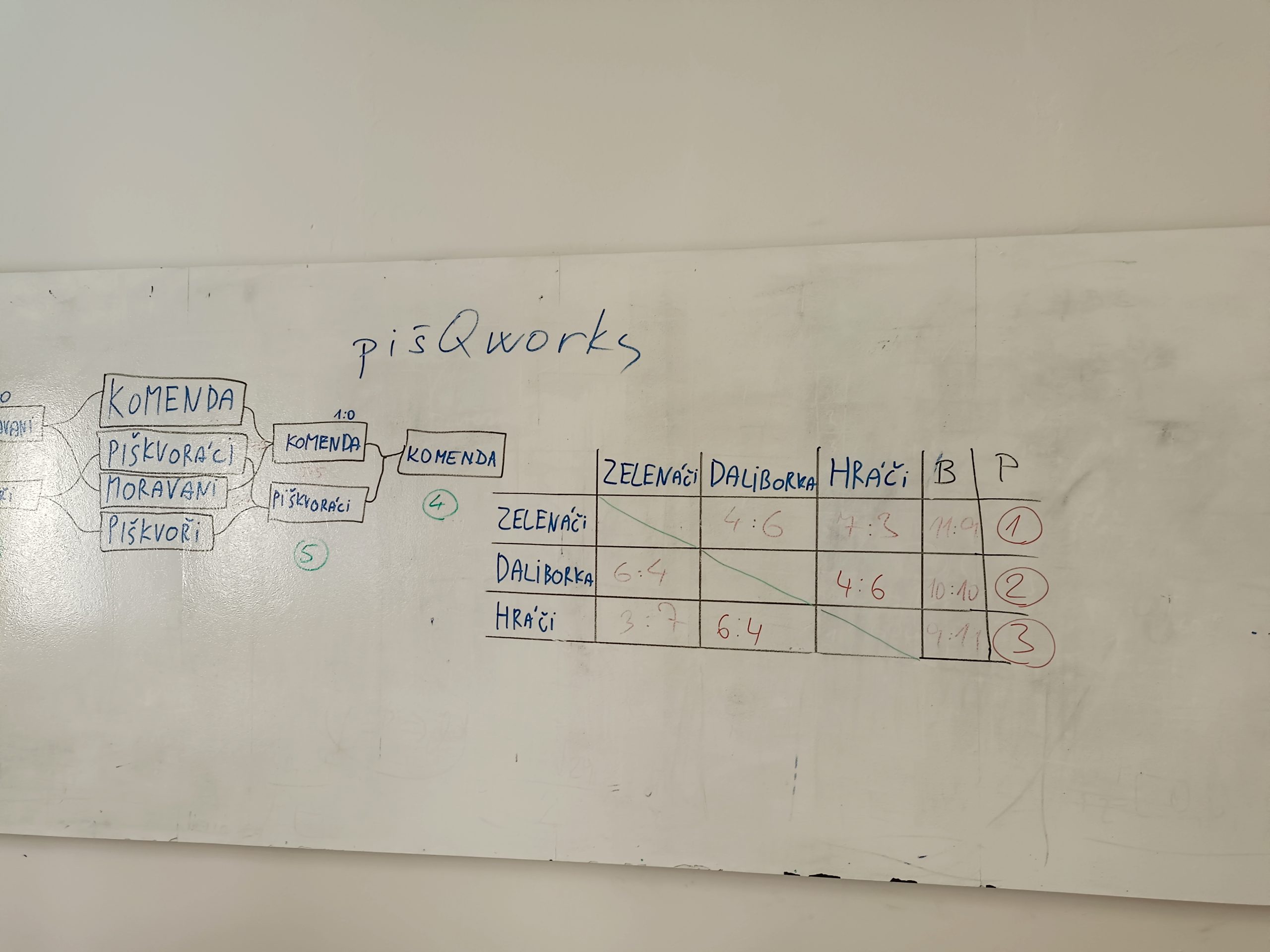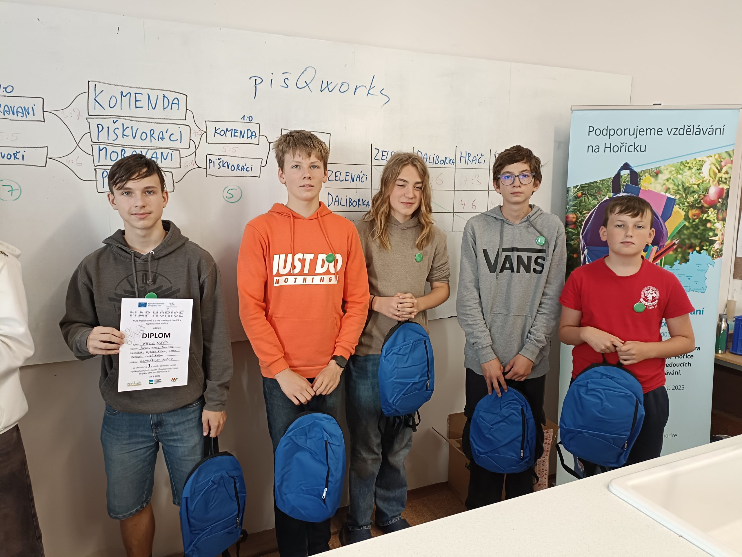 Náš tým Zelenáči (Josef Kašpar (4.G), Vojtěch Klíma (3.G), František Němeček (3.G), Matěj Zamouřil (3.G) a Štěpán Kraus (1.G) nejprve celkem suverénně vyhrál základní skupinu, ale ve finálové skupině si prohrou s týmem Daliborka situaci zkomplikoval. Třetí tým Hráči ze ZŠ Cerekvice však tým Daliborka porazil a s naším prohrál. Rozhodovalo tedy skóre a podle něho se nejtěsnějším rozdílem na 1. místo dostali naši Zelenáči, 2. byli Daliborka a 3. Hráči.