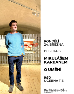 V rámci celoškolní soutěže HUSa se bude v pondělí 24. března 2025 konat beseda s naším bývalým studentem Mikulášem Karbanem. Téma bude jak jinak než Umění. Mikuláš studuje v současné době na Akademii výtvarných umění a je úspěšným výtvarníkem.